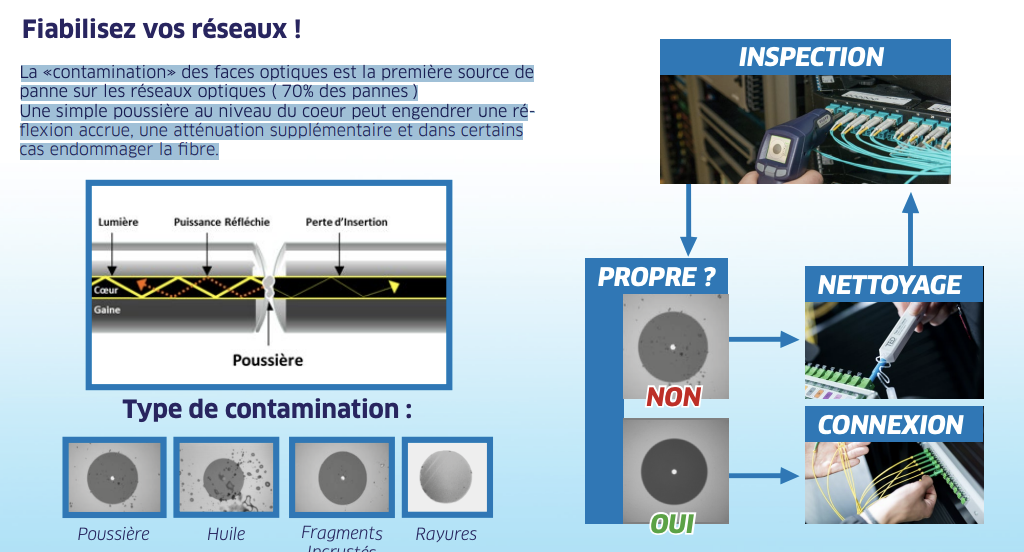 La «contamination» des faces optiques est la première source de panne sur les réseaux optiques ( 70% des pannes ) Une simple poussière au niveau du coeur peut engendrer une réflexion accrue, une atténuation supplémentaire et dans certains cas endommager la fibre.